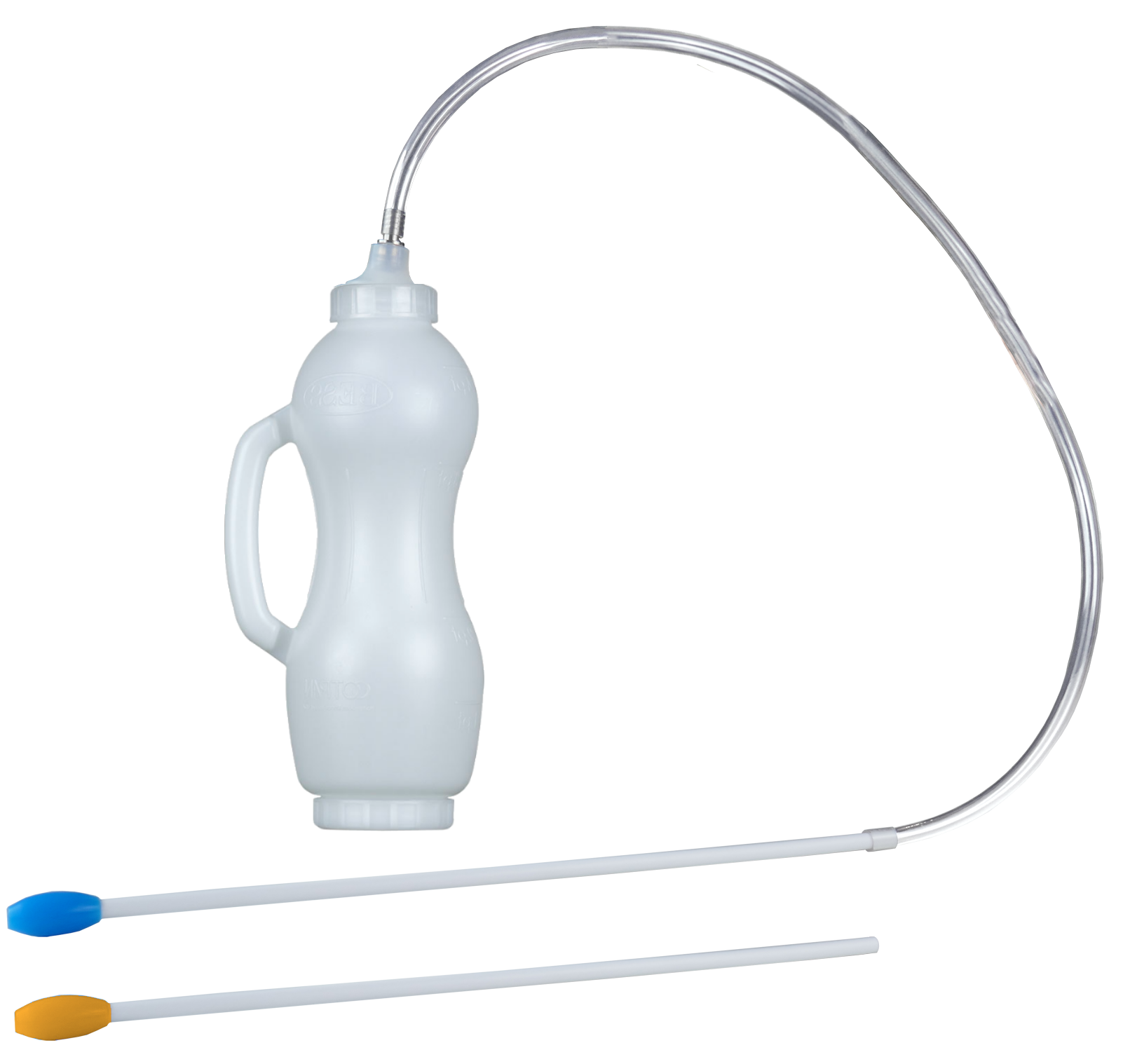 The BESS Drencher is a reliable tool designed to quickly deliver nutritional or hydration support to calves and adult cattle in critical conditions (e.g., feeding difficulties, diarrhea, post-partum recovery, dehydration). It features a 1-meter soft silicone tube, a 50 cm semi-rigid probe with a soft silicone tip, and is available either as an accessory or in a full kit with a BESS calf feeding bottle (2L, 3L, or 4L). Offered in two colors (yellow or blue) for biosecurity identification.