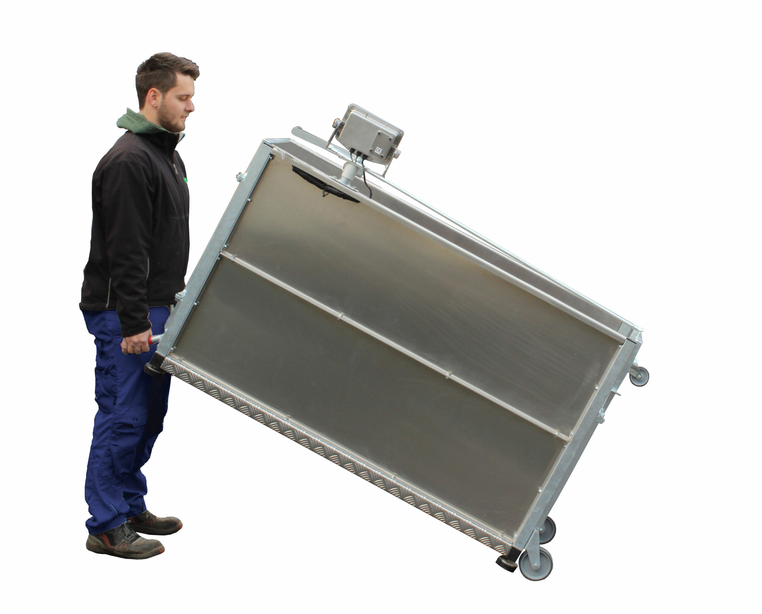 Robust and portable mobile weighing cage designed for weighing calves, sheep, lambs, and pigs up to 300 kg. Easy to move with 3 wheels and compact enough (54 cm wide) for farm corridors. Suitable for indoor and outdoor use thanks to IP67 protection and automatic compensation on uneven ground. Delivered fully equipped with waterproof indicator, weighing cells, and remote lever-operated double doors.