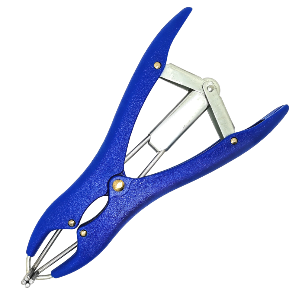 La pince permet d’étendre un anneau de gomme élastique et venir le déposer à la racine du scrotum ou de la queue.